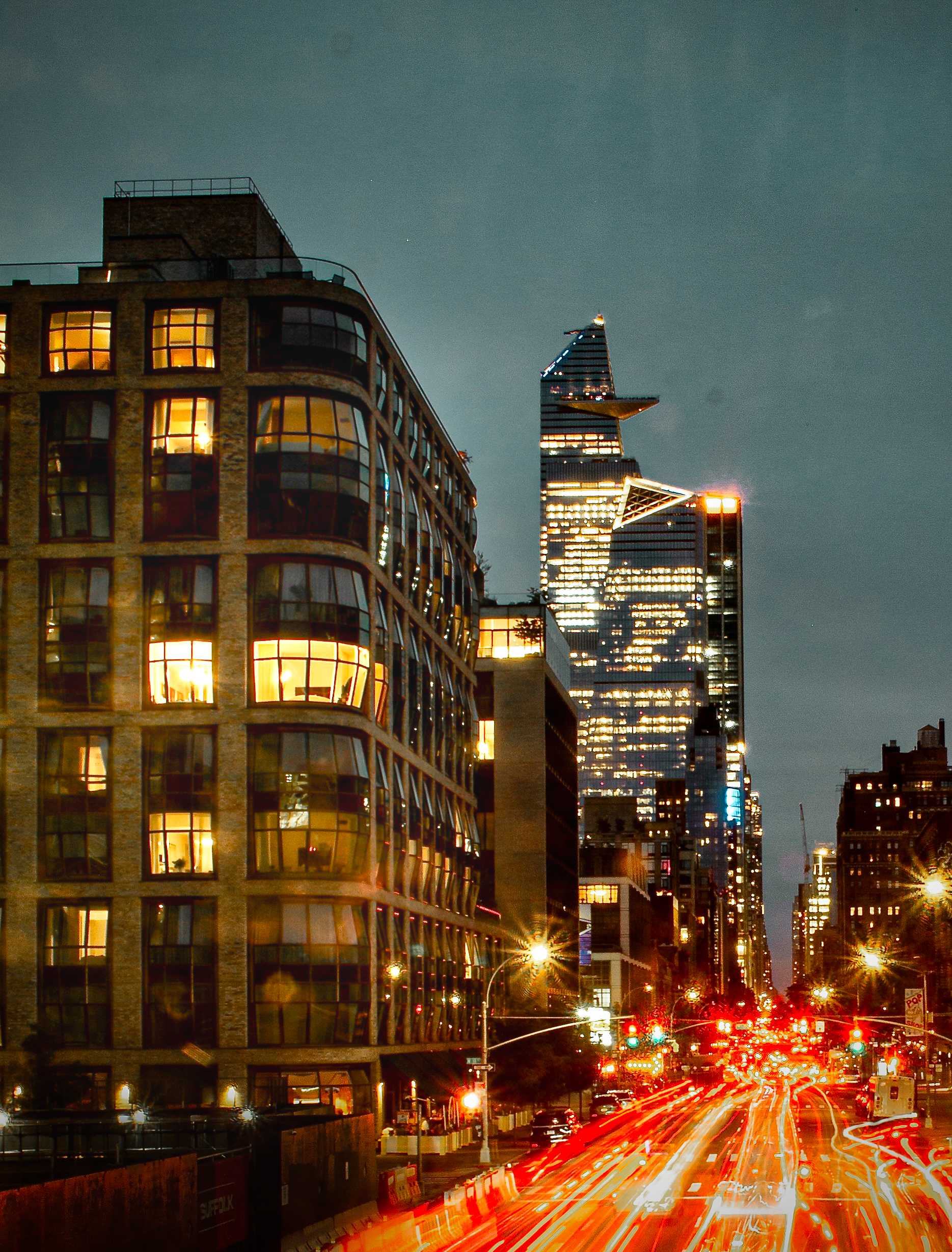 Jean Nouvel's Lantern House is getting outshone by the bright light of rush hour bleeding down 10th Street, reaching The Edge in the background, providing a different perspective of New York City.