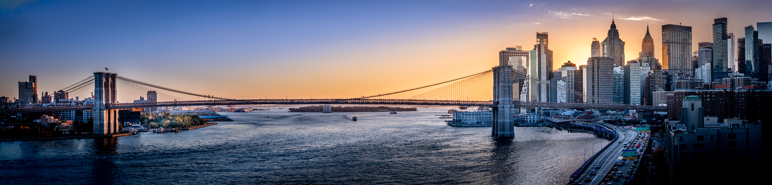 Brooklyn Bridge pano at sunset My flight had arrived from the UK just 3 hours before I took this picture. Having booked into my hotel I grabbed my kit and set off at the pace of a military route march (taking me back a few years!) and still I struggled to get to the bridge on time. A few. minutes previously I had made a decision to deviate to Manhattan rather than Brooklyn, as something told me that the Brooklyn Bridge was the image to capture rather than to take images from. It proved a lucky choice as my phone app predicted arrival day to be the best night for sunset images and it proved absolutely correct. This was the first ever panorama that I captured. I have taken a few photos in my time, but I've never previously had any experience in taking a panorama image. So I decided to give it a go. How pleased I was - this is the sum total of 9 images - taken with crossed fingers and the knowledge that it was worth a go given the glorious image that I anticipated could be possible if I got it right. I feel that the compilation captures the scale and the grandeur that presented that evening and the light was truly magical.