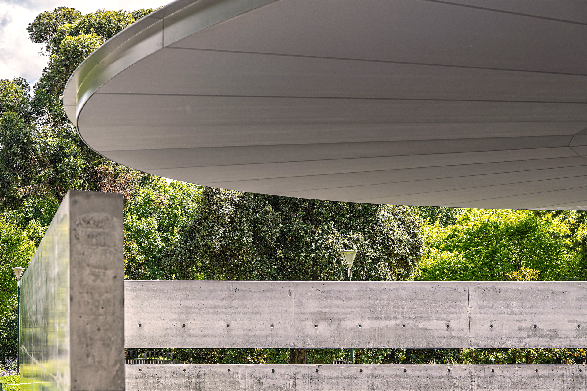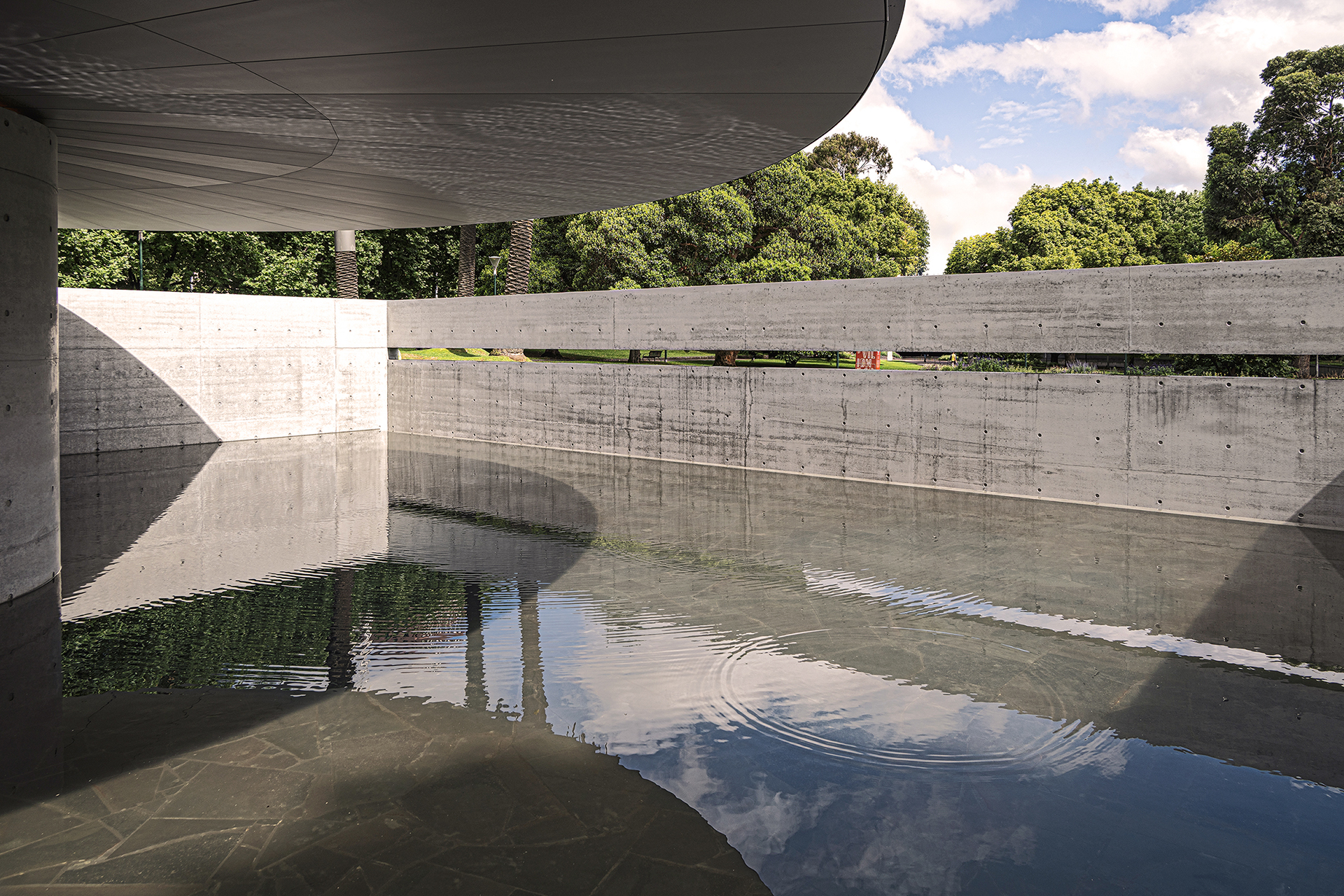 Views of the open air pavilion in Queen Victoria Gardens, Melbourne, Australia. Tadao Ando, architect.