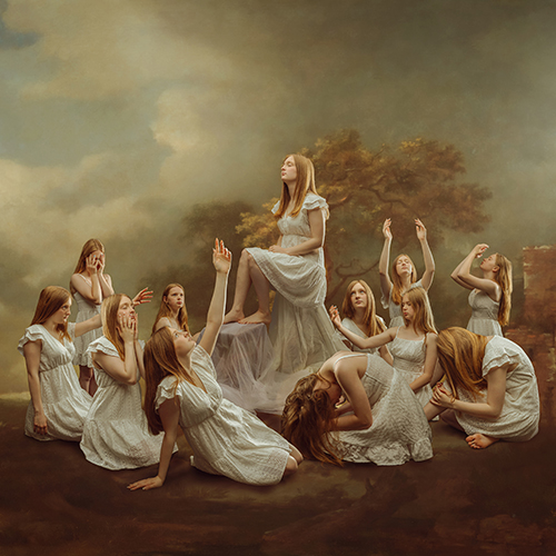 Champagne-coloured horse captured mid-rear at the apex of the lift. Directional light from camera-left sculpts the neck and shoulder