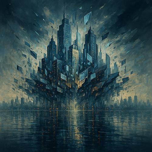 Beneath a muted sky, waves of light and shadow ripple across the ground, surrounding a lone figure. Clad in blue, she drifts weightlessly in silence, as if suspended between earth and air. The blurred boundaries evoke serenity, where emptiness itself becomes a voice.