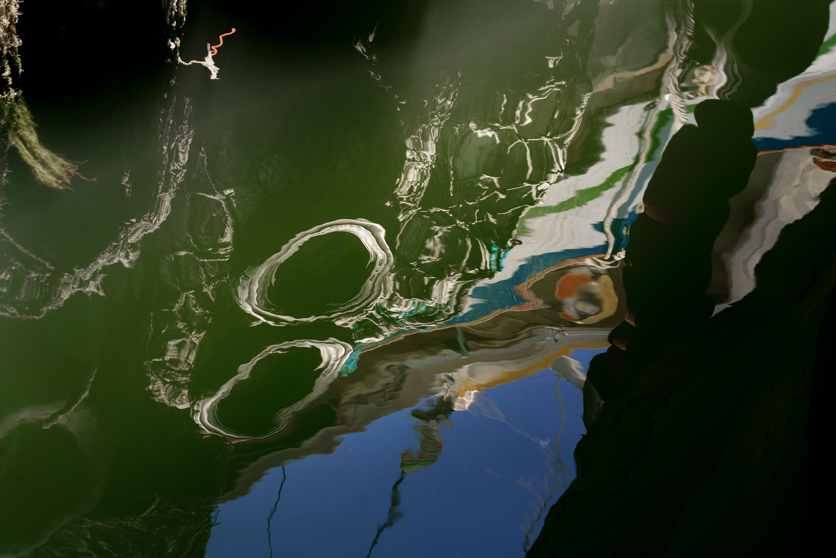 Reflections on water are never mere distortions; they are acts of re-creation. In this series, the surface of the harbor becomes a moving canvas where color, form, and chance converge into new ontologies of vision. The camera does not document objects but receives their dissolution: figures dissolve into specters, architecture liquefies into calligraphic lines, and color vibrates beyond its material origin. This process resonates with contemporary philosophy, where reality is understood not as fixed substance but as flow, becoming, and relational appearance. Each image stages a dialogue between presence and absence, between what is seen and what is imagined. The liquid surface suspends the certainty of form, offering instead a field of potentialities—an unstable geometry in which the viewer is invited to wander. In this instability lies the essence of abstraction: not detachment from the world, but an intensified encounter with its transient conditions. By photographing water as a reflective threshold, the series suggests that truth is never singular; it shimmers, shifts, and multiplies, much like the ripples that carry these images into being.