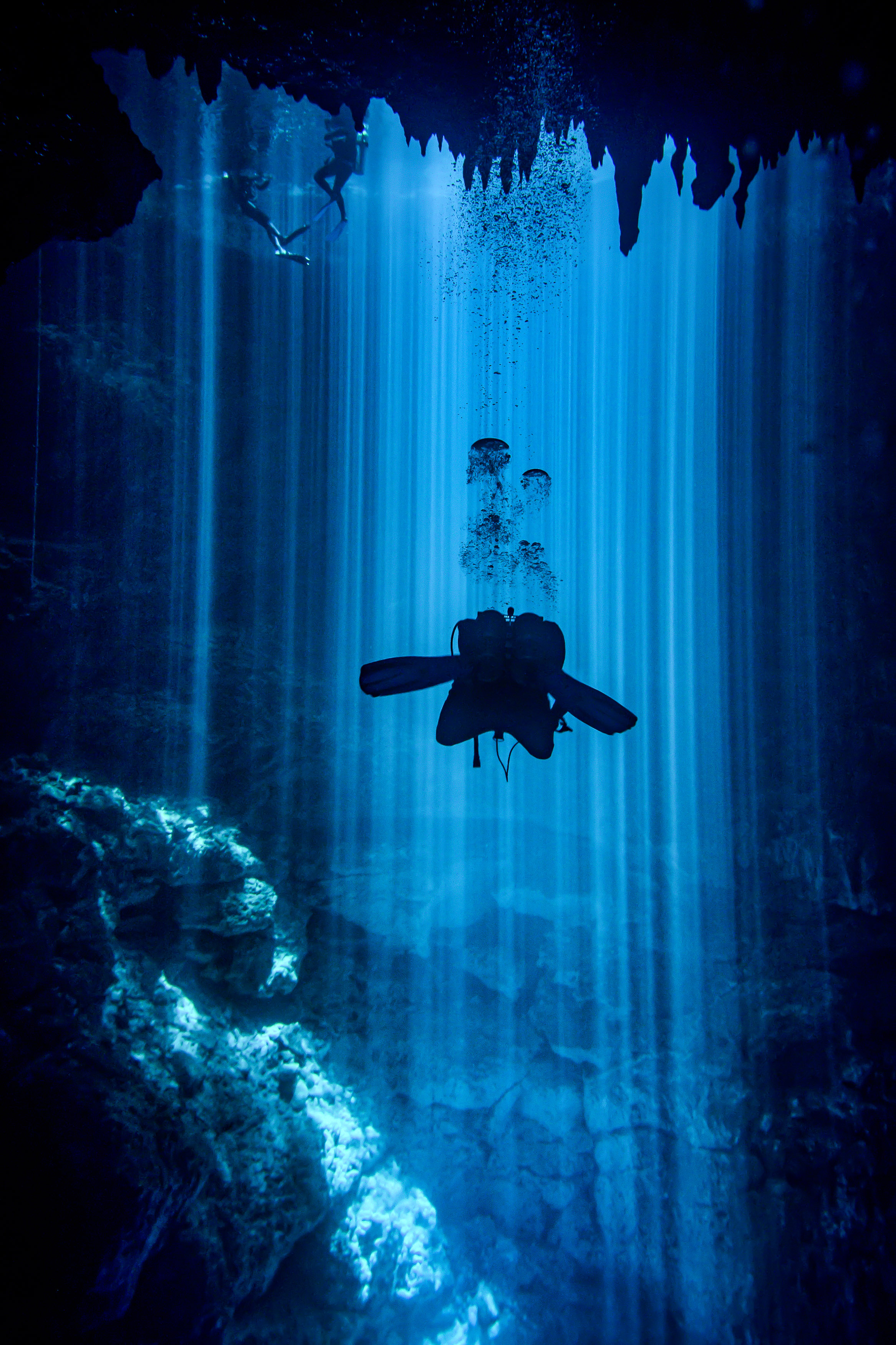 It was a spectacular dive at The Pit, one of the most famous freshwater cenotes in the world. We were originally planning to dive The Pit as our third dive of the day, but when we passed by and saw the sun directly overhead, and not a person around, our guide said "we're diving it NOW!" This was the end of the dive, and you can see a diver and our guide at the surface. When I saw the sun's refractions were directly vertical, I mentioned to the guide behind me to swim around me, creating this magical shot of a diver's silhouette in crystal-clear water at the perfect time of day.