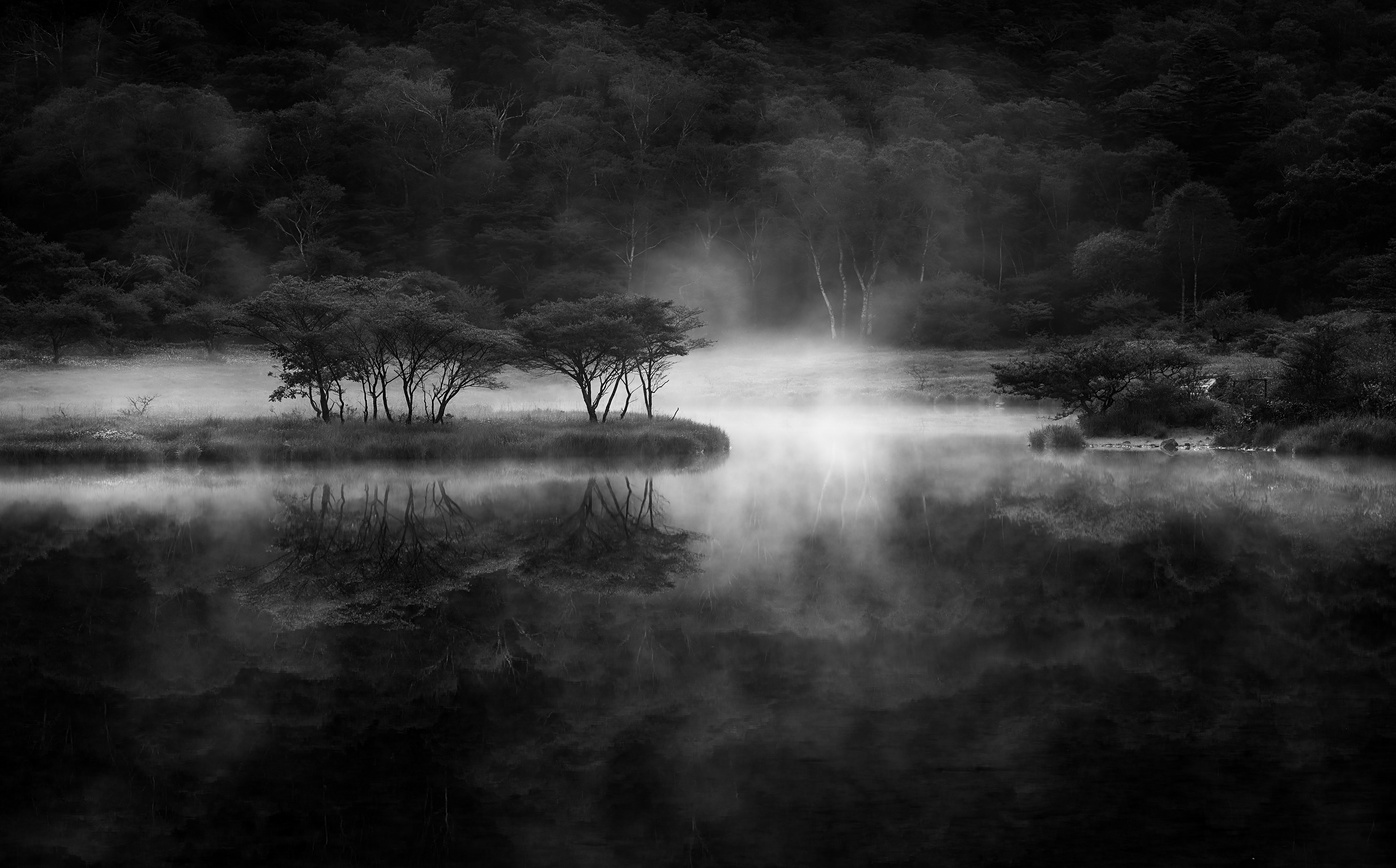 As dawn breaks, a thin veil of mist drapes over the still lake, softening the boundary between reflection and reality. Trees emerge like silent sentinels, their mirrored forms drifting in quiet waters—a monochrome moment where time stands still, untouched by the rush of the world.