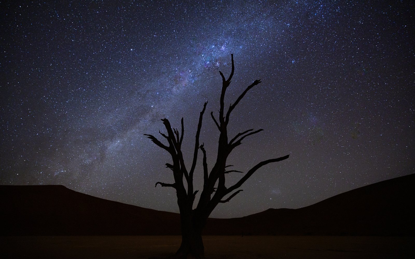 The deadviel valley at night explodes in its incredible beauty. The landscape is enveloped in darkness, emphasizing the grandeur of the celestial display above.