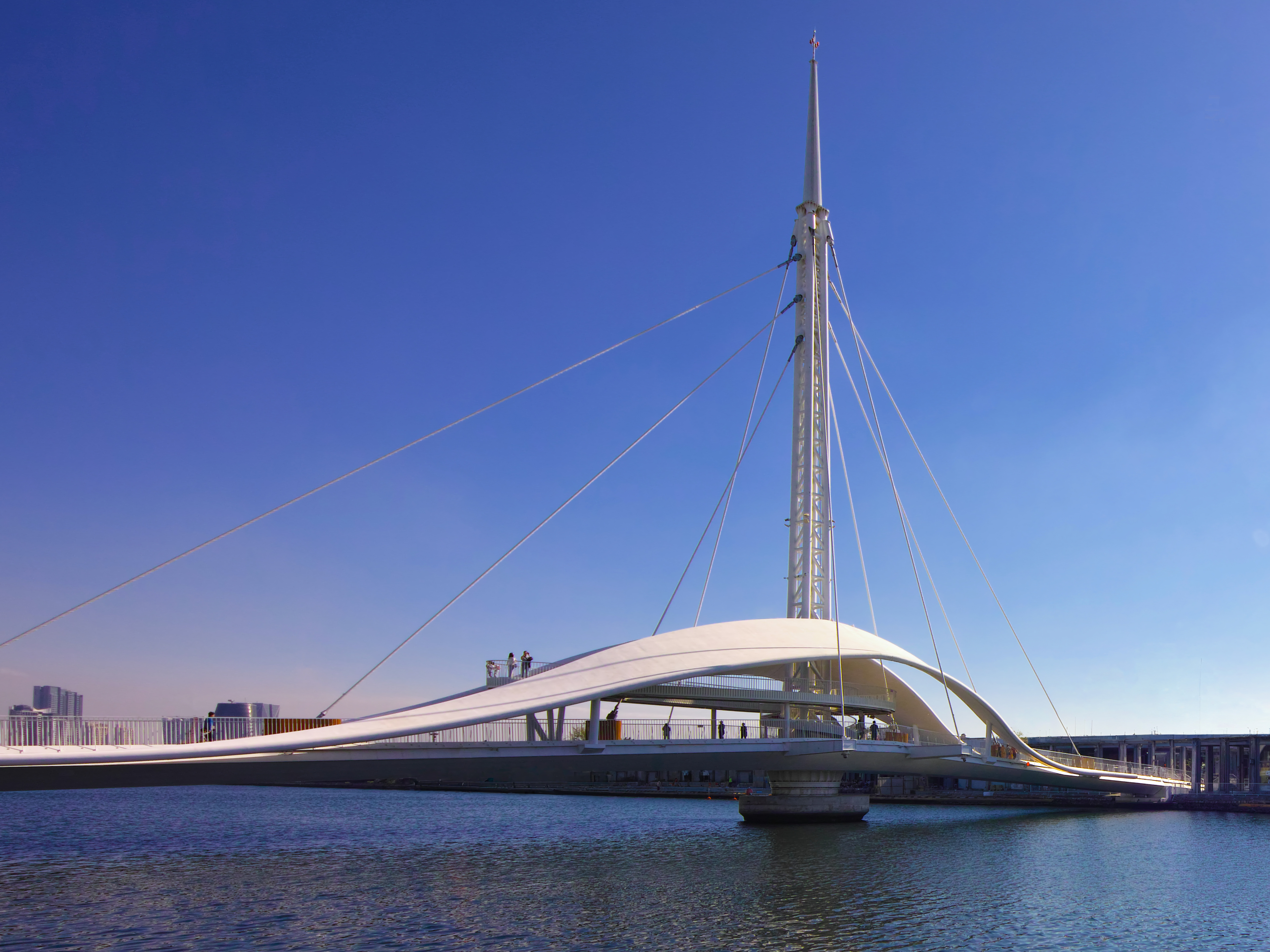 The Great Harbor Bridge is a pedestrian crossing bridge and has a specific design. It can turn 90 degrees to let ships pass the bridge. The bridge not only has its functional purpose but also plays a marvelous sightseeing view.