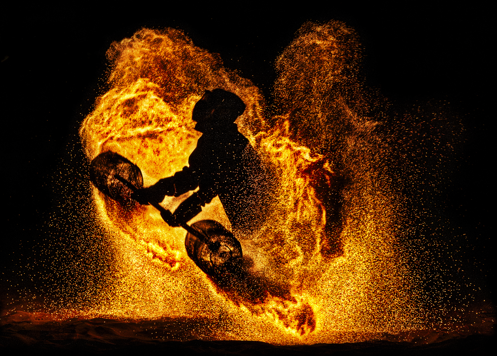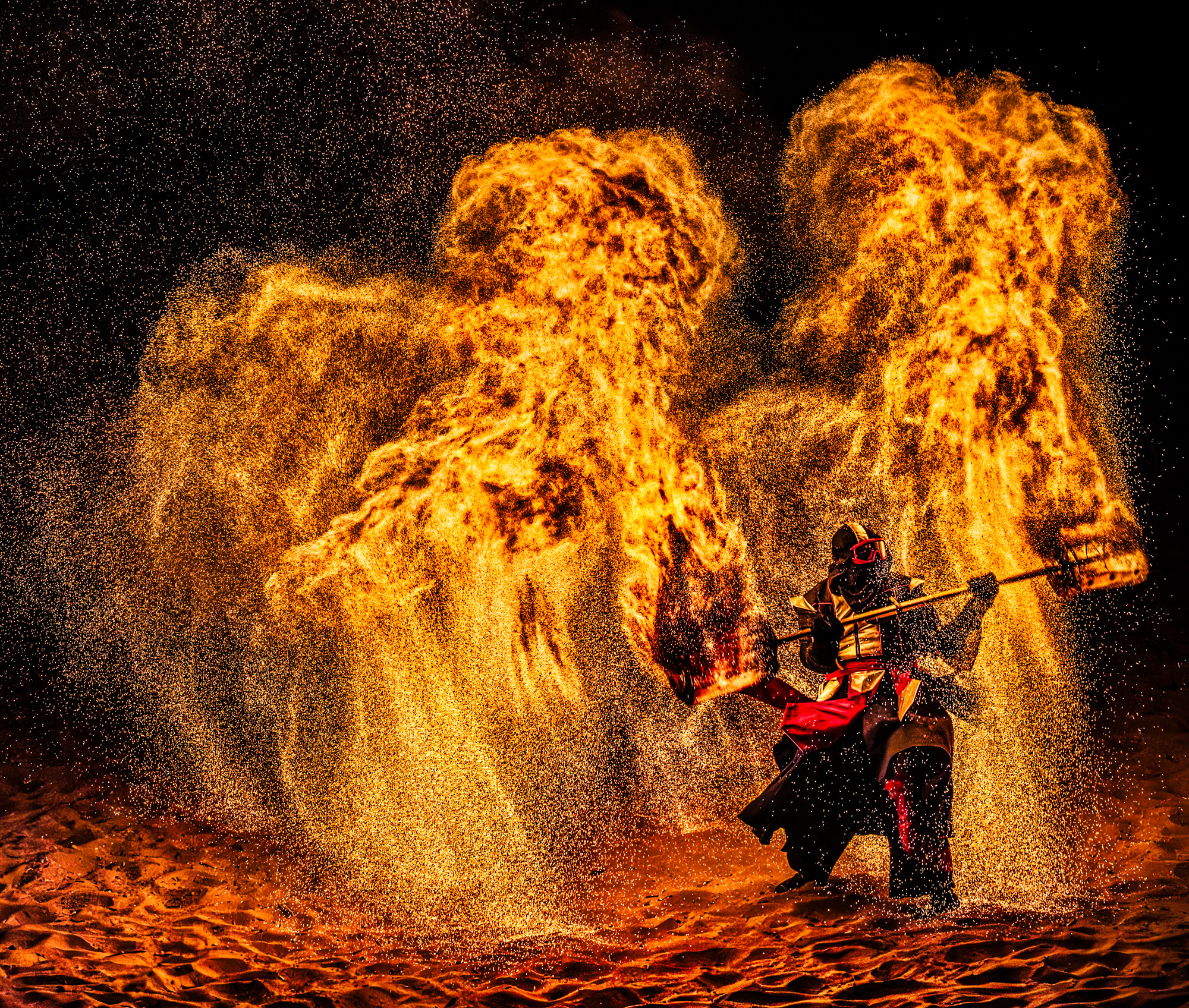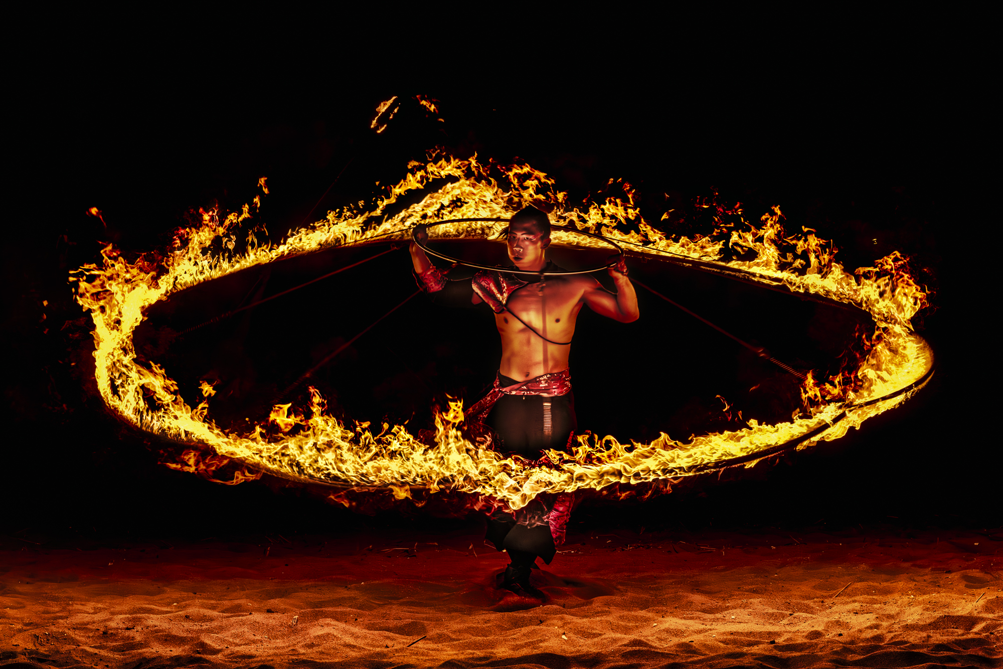 The flames fluttered like a wild phoenix flapping its wings, creating a thrilling feast of light and shadow. The rolling fire wheel blooms like a red lotus, blooming in the air and then falling lightly, bringing an ultimate visual shock. The figure of the fire dancer blends with the flames, as if dancing with the flames, performing a fiery dreamy performance. With every throw, the roller was like a burning storm, drawing brilliant lines of fire in the dark night.