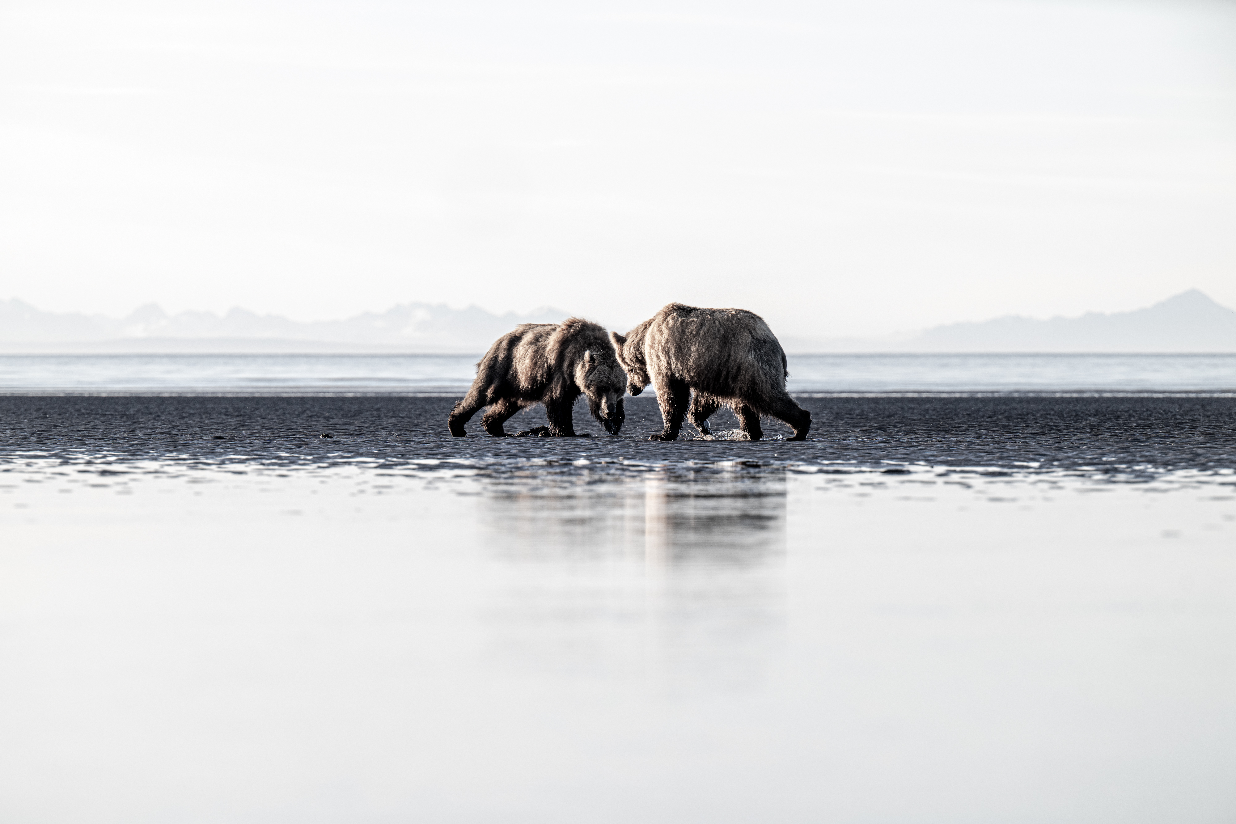 2 bears square off on a beach in Alaska at low tide. Monochromatic treatment