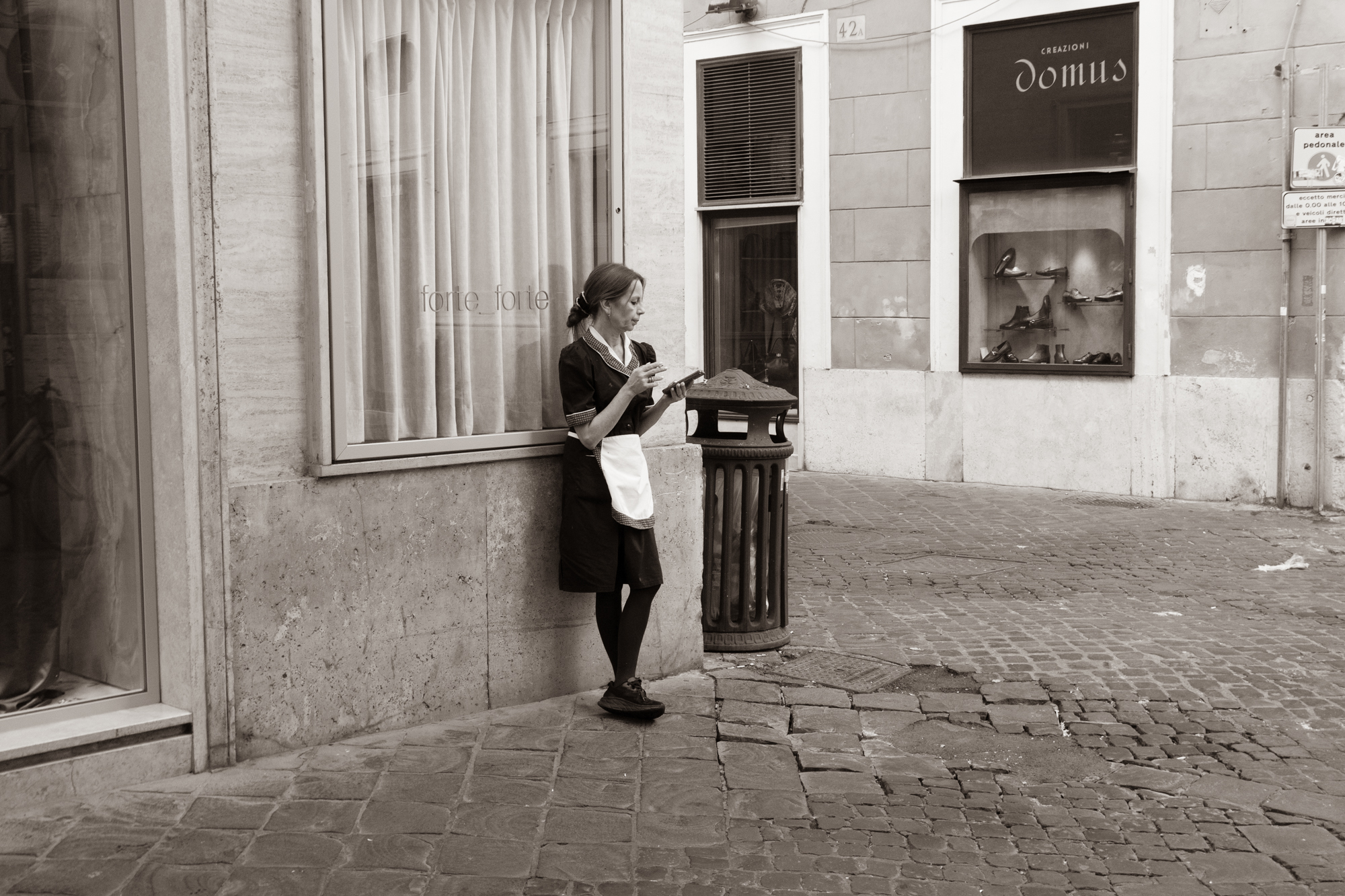 A documentary series capturing the recurring habits of Rome’s service industry. Shot in the same narrow alley behind the Spanish Steps over a period of eight months, these images reveal a timeless loop: waiters, maids, and chefs stepping out of the luxury world to perform the same silent ritual of cigarettes and screens.