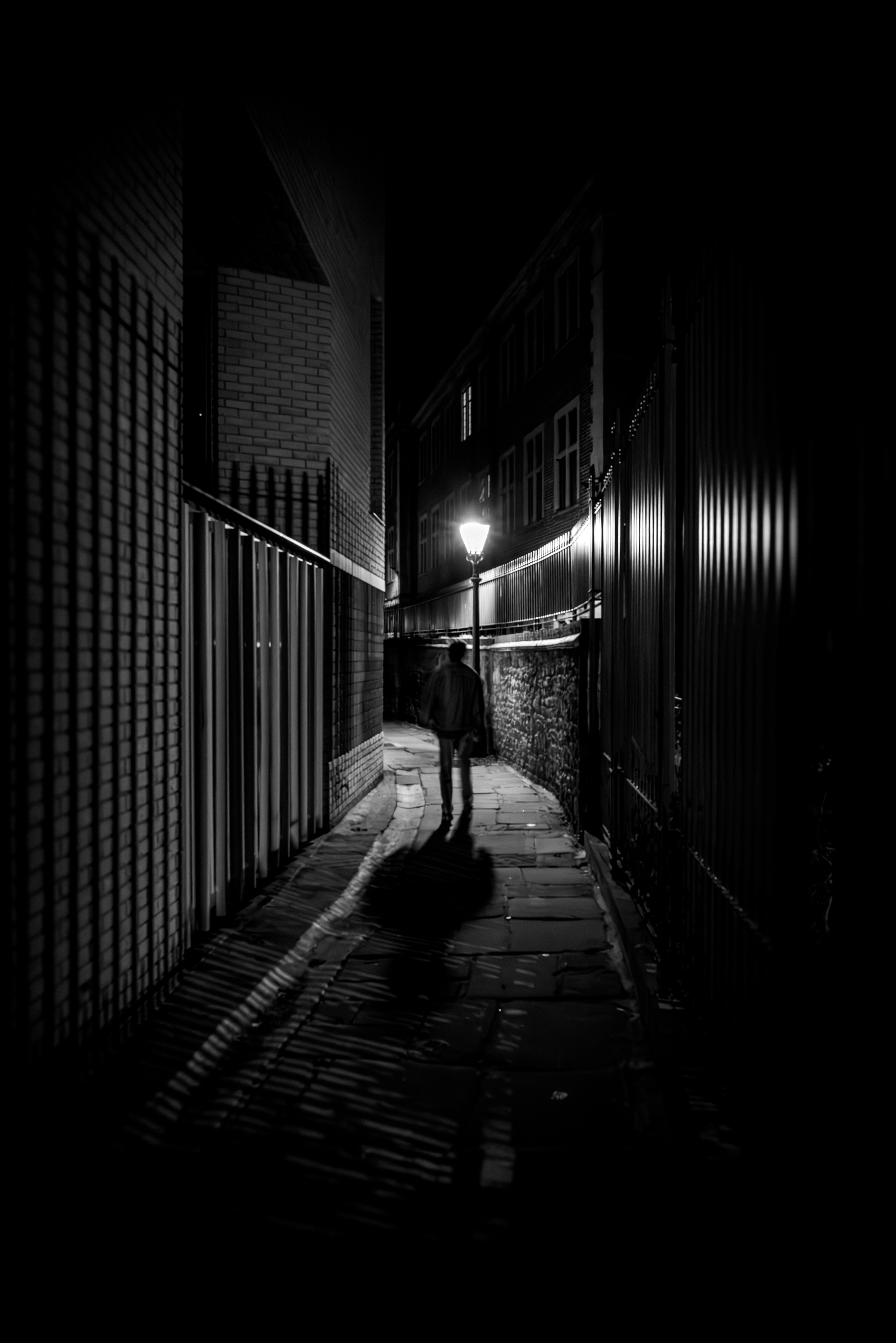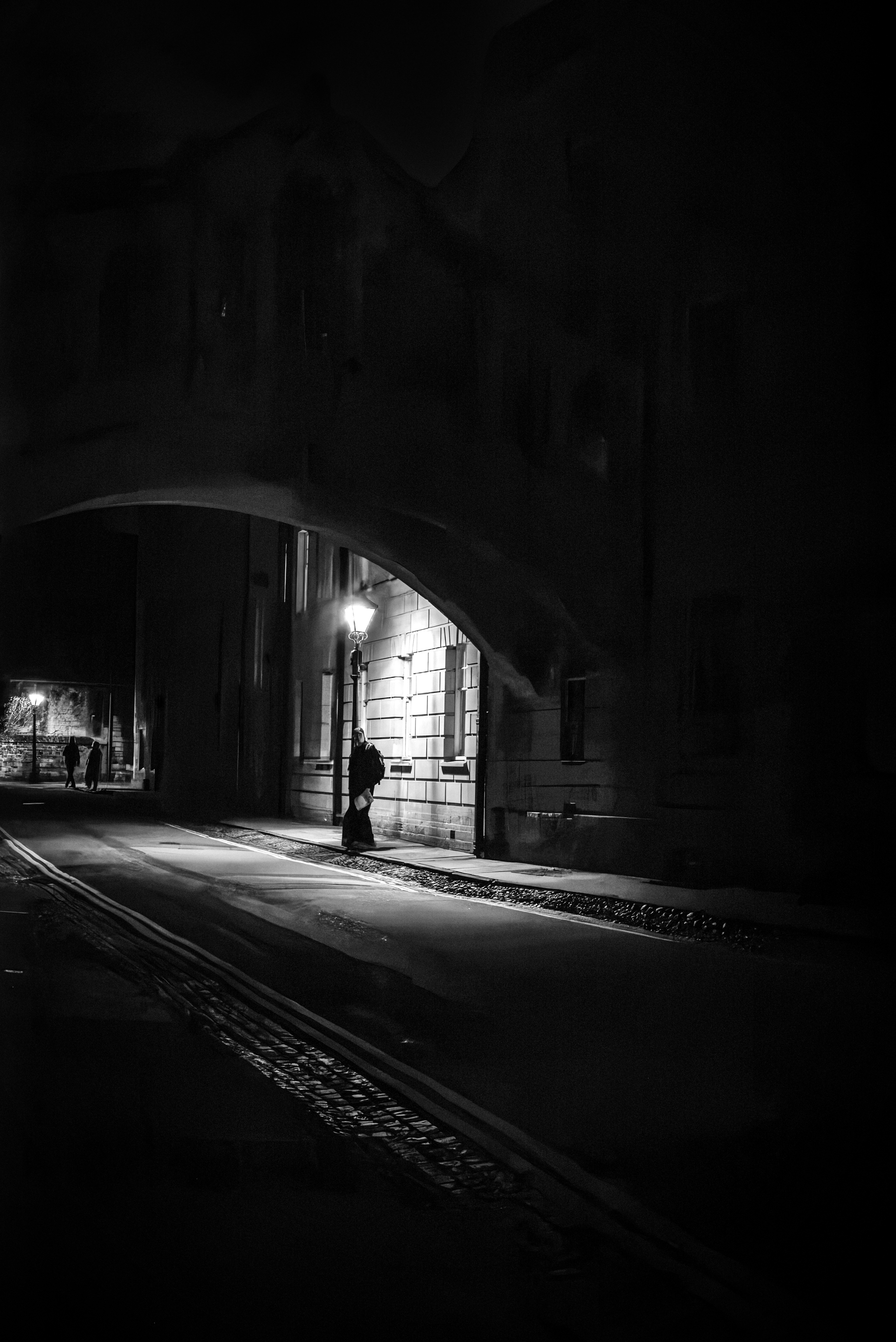 Oxford: Light & Dark is my ongoing exploration of the city after nightfall. Oxford is often shown in picture-postcard light: gold stone, blue skies, historic buildings and quads. For much of the year, though, the city exists in darkness, lit by its Victorian streetlamps. When the crowds leave, another Oxford appears: quieter, more introspective, and full of details that are easy to overlook. I walk these streets at night with my camera, returning to the same places again and again. The lamplight reveals things slowly: the shine of wet cobbles, a bicycle in a doorway, a figure passing through the frame before disappearing again. What sits outside the light becomes suggestion and mood. Influenced by Brassaï and classic night photography, this is not the Oxford of tourist brochures. It is the Oxford that emerges in stillness, where past and present sit in quiet dialogue. These photographs offer a less-seen side of the city, not polished or staged but quietly alive, reduced to texture, tone and fleeting human presence.