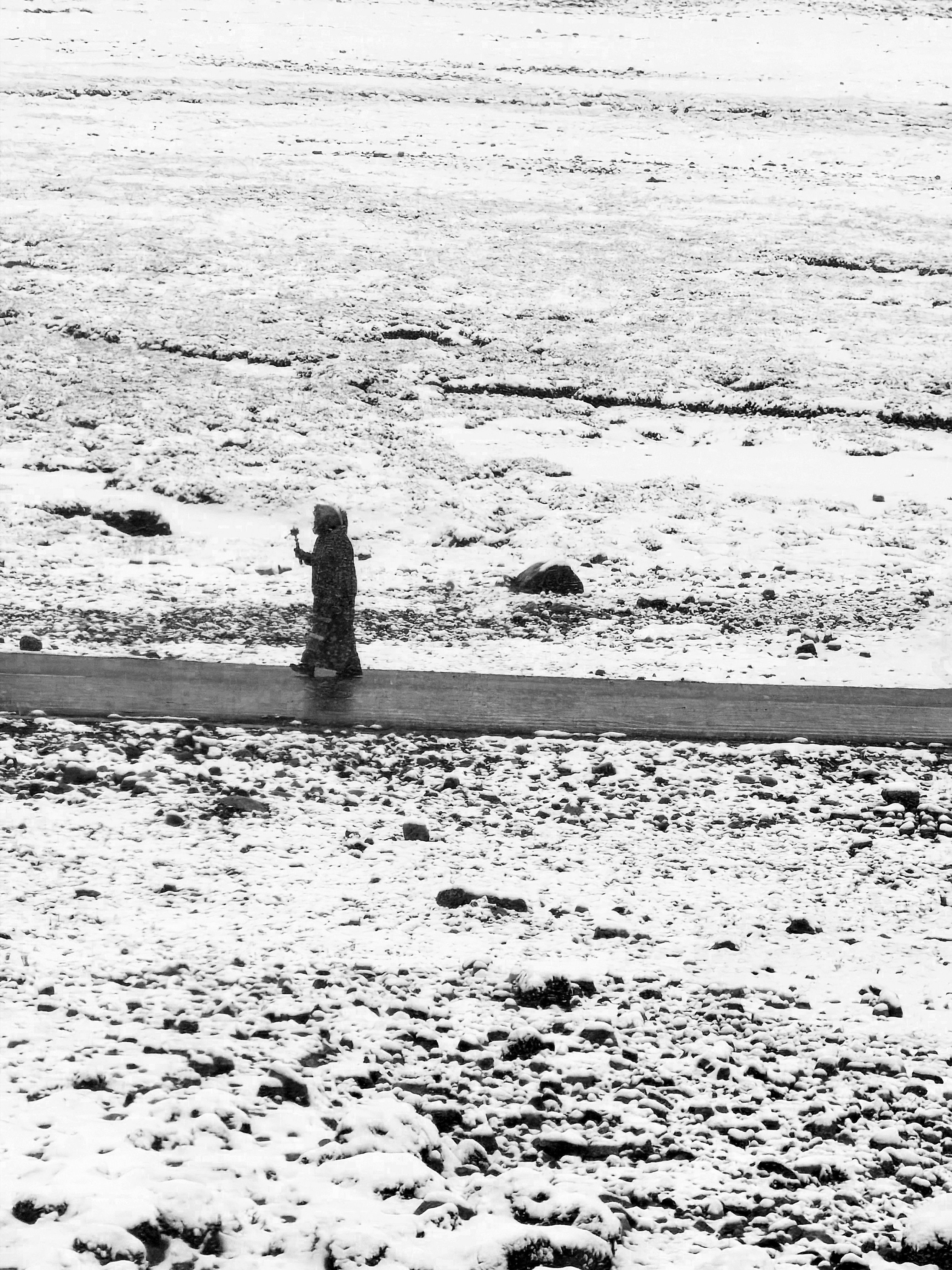 The Qinghai-Tibet Railway cuts through the wilderness, where snowflakes dance in the air, and people and animals suddenly appear, creating a magical scene that is hard to describe.