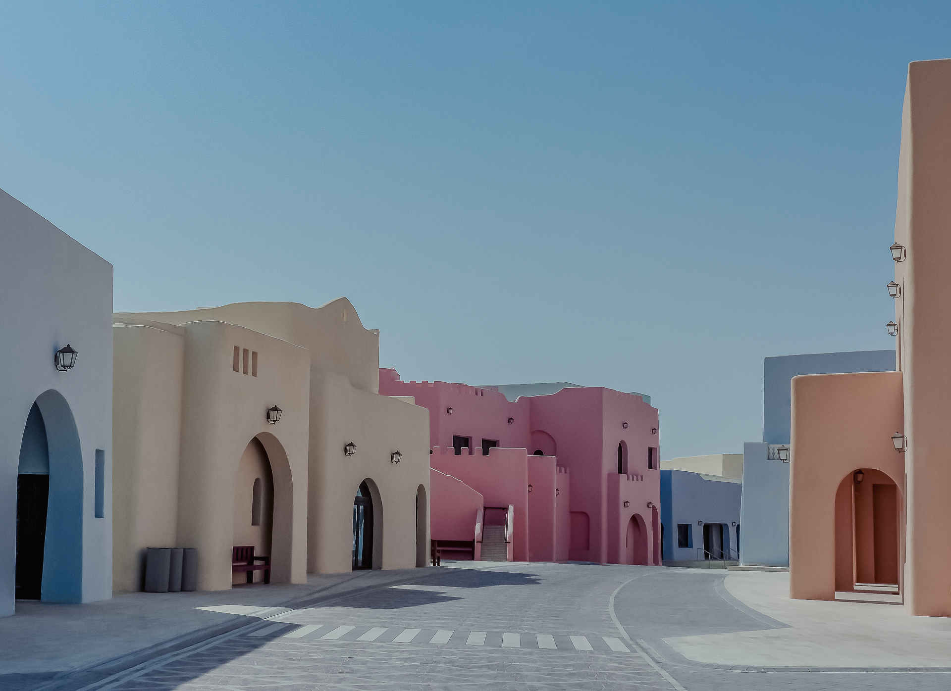 Mina District located on the Old Port in Doha city,Qatar. Mina District a picturesque neighbourhood of quaint cobbled streets and pastel coloured buildings. This whole district is a great spot for photography lovers. There are usually a lot of people in the area, but this photo was taken on a very hot day when there were no people on the street.